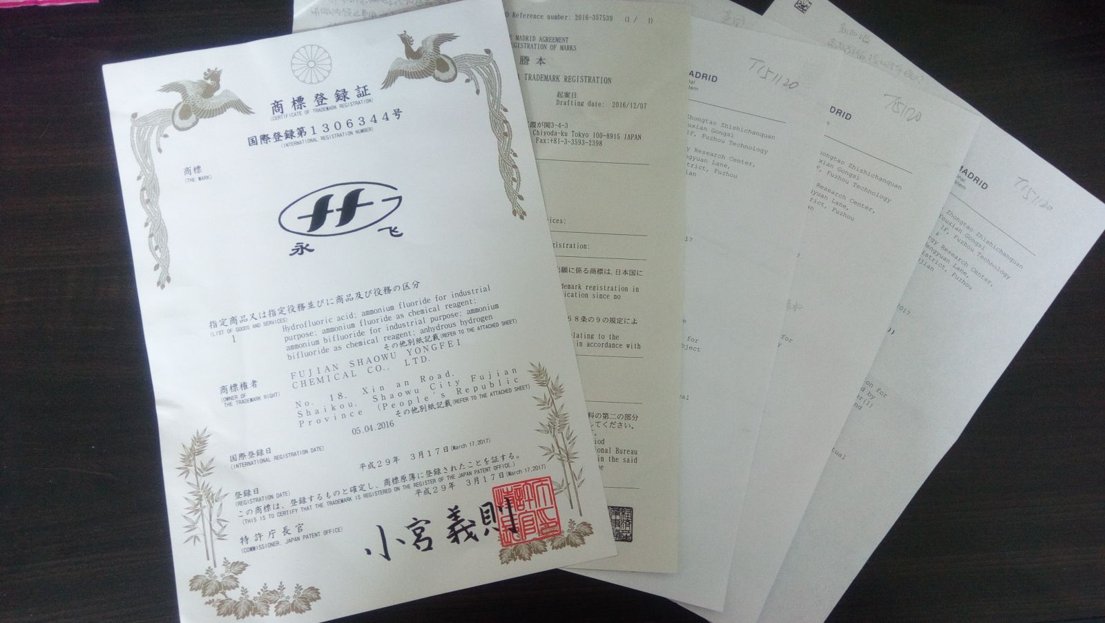 为使企业商标在国外受到法律保护,从而在注册国家获得商标专用权,防止他人侵犯公司在产品销售国家的合法权益,公司于2015年底对“永飞”及图商标向国家局申请,要求通过马德里国际注册体系在11个国家申请注册, 该申请于2016年8月被马德里国际注册机构受理。到目前为止公司已收到美国、德国、英国、捷克、新加坡、日本、韩国等7个国家商标专利局的授权保护通知。